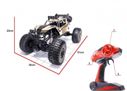 Bucurați-vă de condusul plin de acțiune cu acest model RC impresionant, lung de 51 cm. Datorită tracțiunii 4×4, roților mari și șasiului elastic, depășește cu ușurință gropi, pietre și iarbă înaltă. Controlerul ergonomic tip pistol se potrivește perfect în mână și oferă direcție precisă în teren.