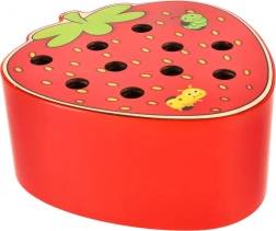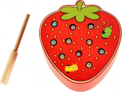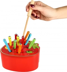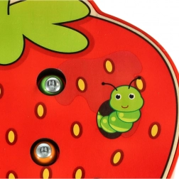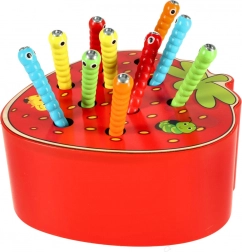 Acest joc magnetic în formă de căpșună îi va captiva pe cei mici pentru ore în șir. În corpul căpșunei se ascund 10 omiduțe colorate cu capete metalice, pe care copilul le prinde și le extrage cu ajutorul baghetei din lemn cu magnet. Varianta mai dificilă constă în a pune omiduțele înapoi, cu precizie, la locul lor.
