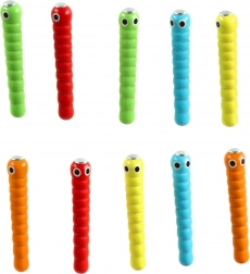 Include o bază din lemn în formă de căpșună, 10 omiduțe colorate cu capăt metalic și o baghetă magnetică din lemn.