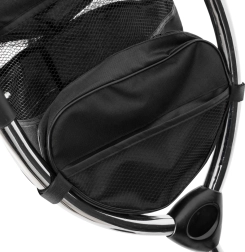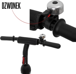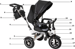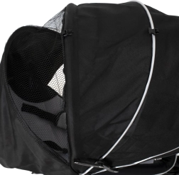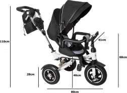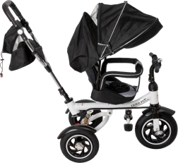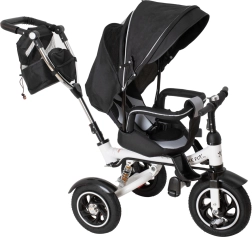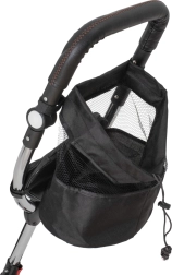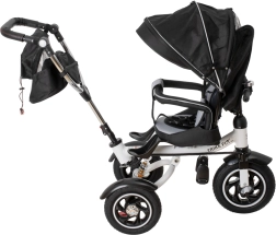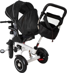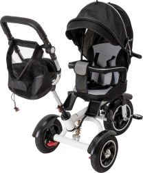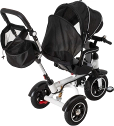 Pentru confort maxim, include scaun tapițat cu spătar, spătar reglabil, capotină pliabilă cu plasă și accesorii practice: geantă și buzunar pe mâner, clopoțel și pedale antiderapante. Frânele spate și elementele reflectorizante sporesc siguranța la utilizarea zilnică.
