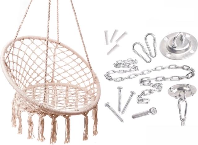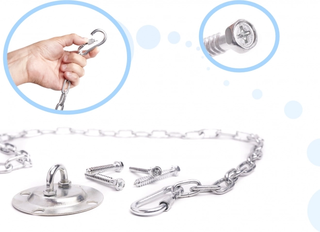 Set complet cu cârlig, șuruburi, lanț și carabiniere pentru o instalare facilă. Potrivit pentru montaj în lemn și beton (cu dibluri corespunzătoare).