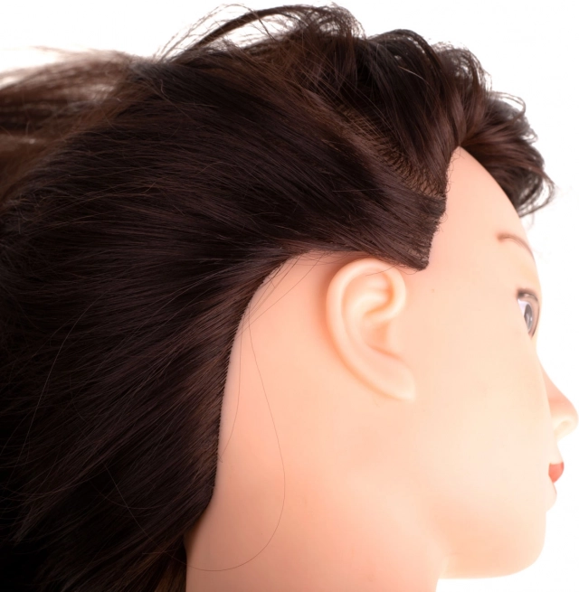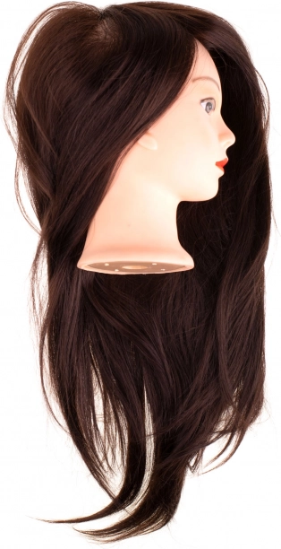 Cap profesional de antrenament pentru coafori, cu păr lung castaniu, ideal pentru exersarea tunsorilor, coafurilor și tehnicilor de coafat termic. Firele sunt implantate în direcția de creștere, astfel încât se descurcă ușor, sunt dense și permit separarea precisă a șuvițelor. Instrument excelent pentru începători și avansați și echipament indispensabil pentru cursuri, competiții și demonstrații.