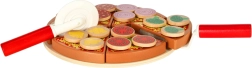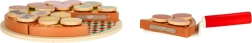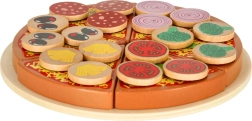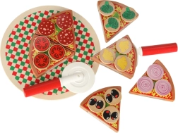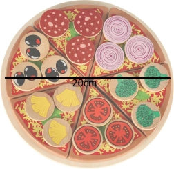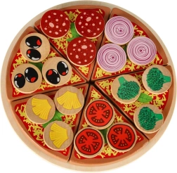 Pizza din lemn amuzantă pentru micii bucătari sprijină motricitatea fină, creativitatea și învățarea tăierii. Felii unite prin bandă cu scai, astfel încât pizza poate fi „tăiată” cu cuțitul inclus și servită cu lopățica. Setul conține 27 de piese, inclusiv toppinguri, cuțit, lopățică și farfurie.