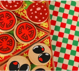 Conține 6 felii de pizza, 18 toppinguri din lemn diverse, un cuțit, o lopățică și o farfurie. Copiii pot combina ingredientele preferate și pot servi întreaga familie.