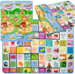 Acest covoraș de joacă cu două fețe oferă copiilor un loc sigur și confortabil pentru joacă și învățare zilnică. Dimensiunile generoase de 180 × 120 cm și spuma moale protejează de frigul podelei și amortizează eficient micile căzături. O față este plină cu litere pentru o învățare mai ușoară a alfabetului, cealaltă aduce un peisaj de basm cu animale, care stimulează imaginația.