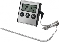 Facilitați-vă prepararea mâncărurilor cu termometrul digital cu termosondă. Acest termometru este fabricat din materiale de înaltă calitate și dispune de o sondă din oțel inoxidabil. Măsurătorile sunt posibile în grade Celsius și Fahrenheit, cu un interval larg de la -25° C până la +250° C.