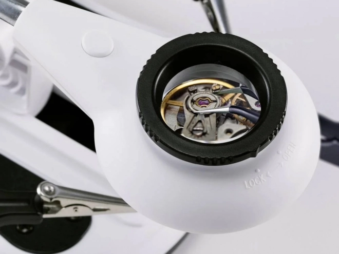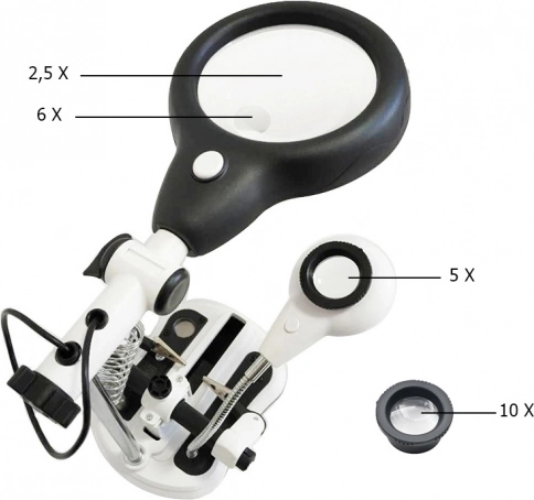 Lentila mare de 10,4 cm și lentila mică interschimbabilă de 2,8 cm oferă măriri de 2,5x, 5x, 6x și 10x pentru lucru detaliat în electronică și mecanică.