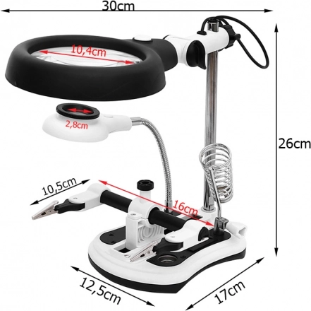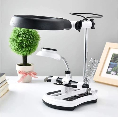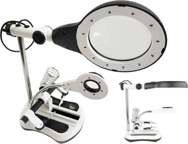Lupă multifuncțională cu suport tip „a treia mână” pentru lipire și reparații precise. Oferă mărire 2,5x/5x/6x/10x, 12 + 6 LED-uri cu două moduri de iluminare și bază stabilă cu organizatoare. Datorită brațelor ajustabile, clemelor crocodil și suportului pentru letcon, este ideală pentru electronică, ceasornicărie și lucrări fine de modelism.