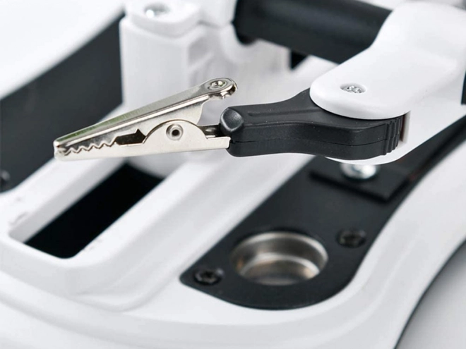 Brațele reglabile cu cleme crocodil ferme fixează piesele în poziția ideală. Spirala pentru letcon și curățătorul de vârf accelerează și îmbunătățesc precizia lucrului.