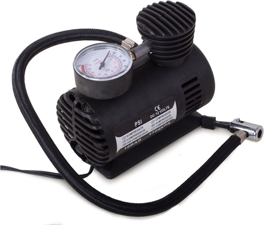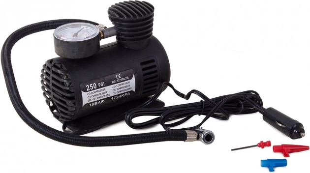 Pachetul include compresorul cu furtun, fișă pentru bricheta auto, manometru și set de adaptoare pentru diverse nevoi.