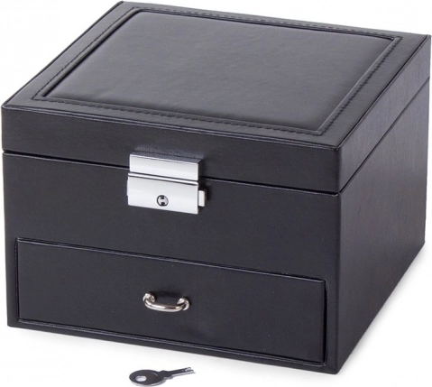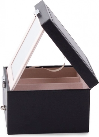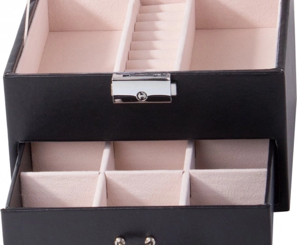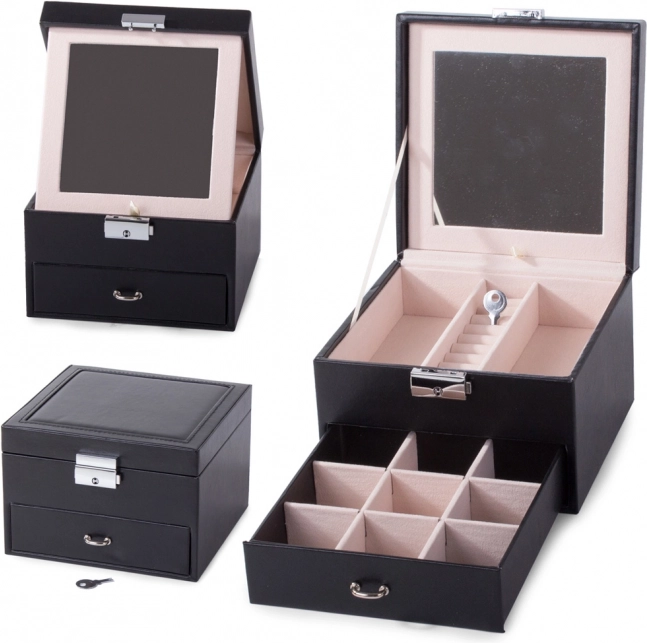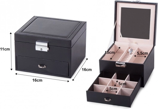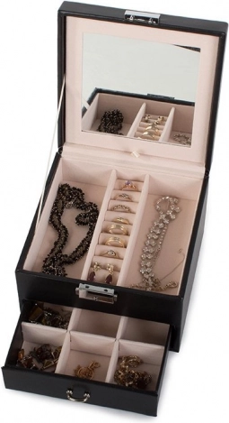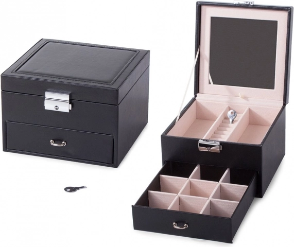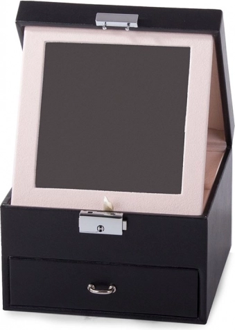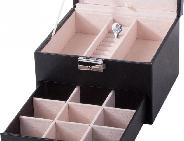 Capacul superior ascunde o oglindă, două compartimente mai mari și o secțiune specială pentru inele. Sertarul inferior oferă nouă compartimente mai mici pentru bijuterii mărunte. Încuietoarea cu cheie îți oferă siguranța că obiectele de preț vor fi protejate.