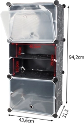 Acest dulap se caracterizează prin ferestre transparente, care permit găsirea rapidă a obiectelor depozitate, iar ușile pot fi montate după nevoie, sus sau jos. Materialul rezistent la apă asigură o întreținere ușoară și o durată lungă de viață. Pachetul include și un ciocan de lemn pentru asamblare simplă.