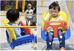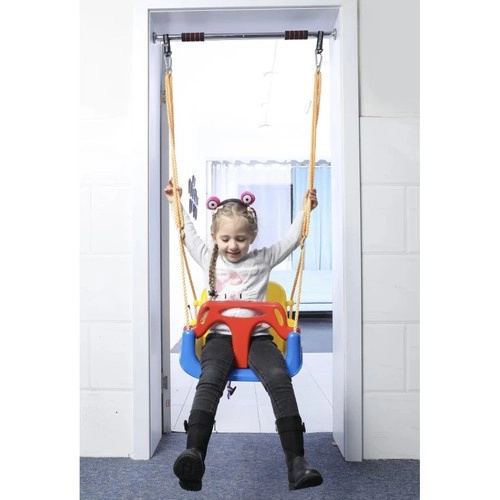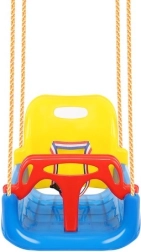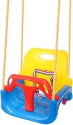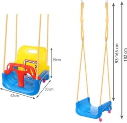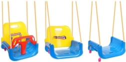 Acest leagăn colorat 3‑în‑1 este o alegere excelentă pentru bebeluși și copii mai mari. În configurația cu bară în T și spătar înalt transportă în siguranță pe cei mici, iar mai târziu poți îndepărta piesele frontală și posterioară pentru a-l transforma într-un șezut clasic. Curelele de siguranță reglabile fixează copilul ferm, iar textura antiderapantă a șezutului previne alunecarea chiar și în timpul jocului mai energic.