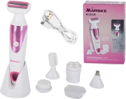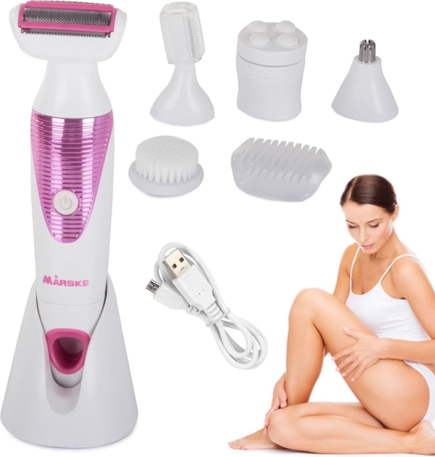 Set practic pentru îngrijirea zilnică a corpului într-un singur dispozitiv: depilator feminin 5 în 1 cu capete interschimbabile pentru bărbierit, epilarea sprâncenelor, tunsul părului din nas și urechi, curățarea tenului și masaj. Datorită formei ergonomice și suprafeței antialunecare, se ține confortabil în mână, este blând cu toate tipurile de piele și nu provoacă iritații și nu agață. Cap de ras lavabil, funcționare fără fir și suport comod pentru utilizare și depozitare ușoară.
