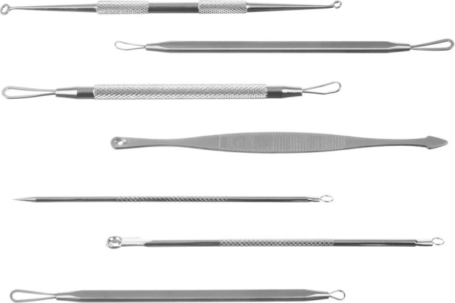 Acest set practic conține 7 instrumente pentru comedoane, cu două capete (în total 14 capete de lucru), pentru curățarea delicată și precisă a pielii. Bucle mai mari ajută la coșuri și puncte albe, iar buclele mai mici și vârfurile sunt ideale pentru punctele negre din zonele greu accesibile. Oțelul inoxidabil este durabil, igienic și se sterilizează ușor.