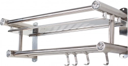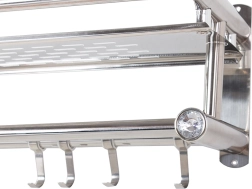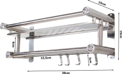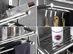 Acest raft de baie montat pe perete oferă o soluție ingenioasă pentru economisirea spațiului și pentru ordine lângă duș sau lavoar. Partea superioară găzduiește comod cosmeticele și mărunțișurile, iar partea inferioară oferă o bară dublă pentru prosoape și patru cârlige pentru accesorii. Designul minimalist, în culoare argintie, emană eleganță și simplitate.