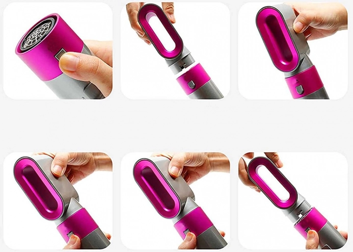 Concentrator pentru uscare rapidă, perie plată pentru netezire și perie rotundă pentru volum și bucle naturale. Schimbare simplă și rapidă în câteva secunde.