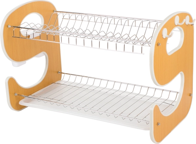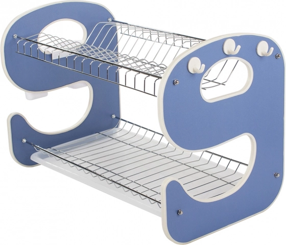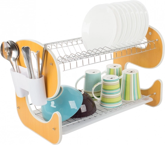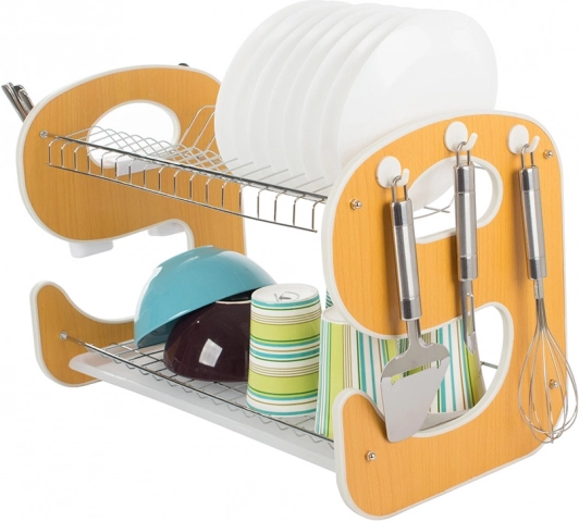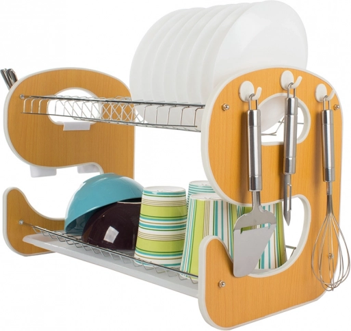 Suportul practic de uscare pentru vase pe două niveluri, cu tavă de scurgere, păstrează bucătăria în perfectă ordine. Oferă construcție stabilă, capacitate de până la 14 farfurii, 2 niveluri de uscare pentru farfurii, boluri și căni și organizator suspendat pentru tacâmuri cu cârlige pentru accesorii de bucătărie. Combinația de metal și plastic rezistent asigură durabilitate îndelungată și rezistență la umiditate.