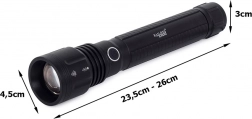 Datorită funcției de zoom, distanța focală a luminii poate fi ajustată lin, cu o rază de acțiune de până la 1000 de metri. Pentru alimentare, sunt folosite baterii litiu-ion 26650 de înaltă calitate, care prelungesc durata de funcționare. Lanterna oferă mai multe moduri de iluminare: 100%, 75%, 50%, stroboscop și SOS.