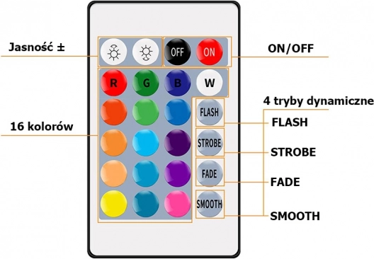 - 16 culori statice, FLASH, tranziții în 7 culori pas cu pas, mod automat, reglare luminozitate, pornire/opriere