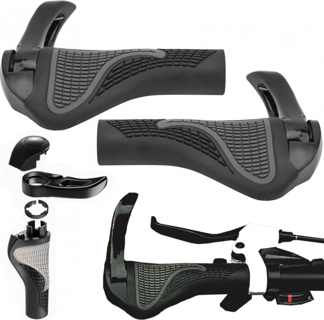 Aceste mânșoane cu formă anatomică, din cauciuc antiderapant, oferă confort chiar și în ture mai lungi. Suprafața moale atenuează șocurile și ajută la menținerea încheieturii în poziția corectă, în timp ce coarnele din aluminiu integrate permit schimbarea prinderii și reduc oboseala mâinilor.