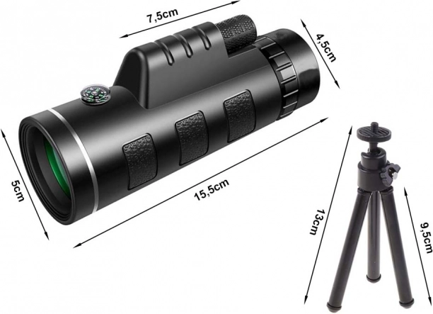 Monocular compact 40×60 cu trepied și suport pentru telefon pentru cadre stabile și observație confortabilă. Oferă obiectiv mare de 40 mm, corp antiderapant, corecție dioptrică și focalizare centrală. Excelent pentru drumeții, camping, observarea animalelor și a evenimentelor sportive.