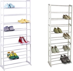 Păstrează ordinea în încălțăminte cu un raft practic ce îmbină greutatea redusă, rezistența și versatilitatea. Construcția din stâlpi de plastic și țevi metalice asigură stabilitatea, în timp ce barele transversale cromate elegante și culoarea albă se potrivesc ușor unui interior modern.
