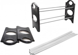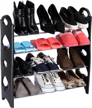 Construcția segmentată combină țevi metalice (cromate) cu stâlpi din plastic rezistent. Fiecare țeavă are trei orificii de montaj, astfel încât ajustați cu ușurință înălțimea polițelor pentru pantofi cu toc și teniși. Raftul poate fi extins cu niveluri suplimentare – unind două seturi, dublați capacitatea. Montajul este rapid, iar la demontare ocupă minimum de spațiu.