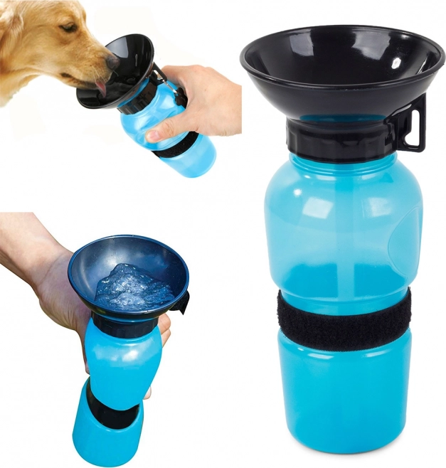 Sticlă de călătorie practică pentru câini, cu bol integrat pentru adăpare confortabilă în timpul deplasărilor. Este suficient să strângi sticla și apa se va turna în bol. Datorită închiderii anti-picurare, nu există risc de scurgeri în rucsac, iar cu mânerul atașat și curelușa cu arici o poți prinde ușor de curea sau rucsac. Ideală pentru plimbări, drumeții și călătorii pe timp cald.