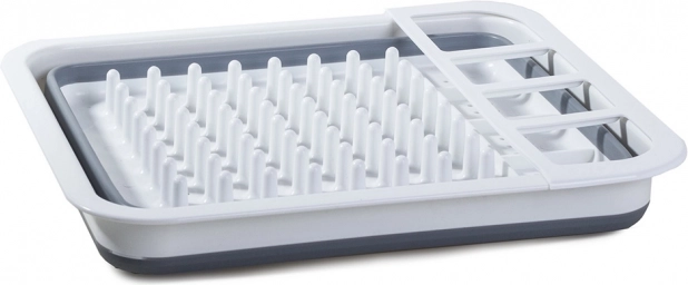 Acest scurgător de silicon este un ajutor revoluţionar pentru fiecare casă. Îl desfaceţi rapid în câteva secunde şi când nu mai aveţi nevoie de el, îl pliaţi şi îl depozitaţi cu uşurinţă în dulap. Are spaţiu pentru farfurii, ceşti şi un scurgător separat pentru tacâmuri, ceea ce îl face un dispozitiv multifuncţional.