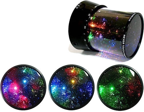 Carcasa cilindrică a proiectorului proiectează pe pereți și tavan stele și constelații în culori vii, creând o atmosferă plăcută, înstelată, pentru relaxare și adormire.