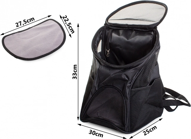 Păstrați-vă animalul sub supraveghere, datorită posibilității de a-l purta în partea din față. Rucsacul este disponibil în culoare neagră și suportă până la 10 kg greutate.