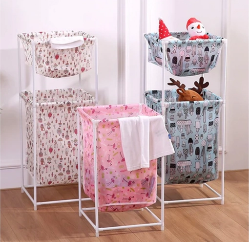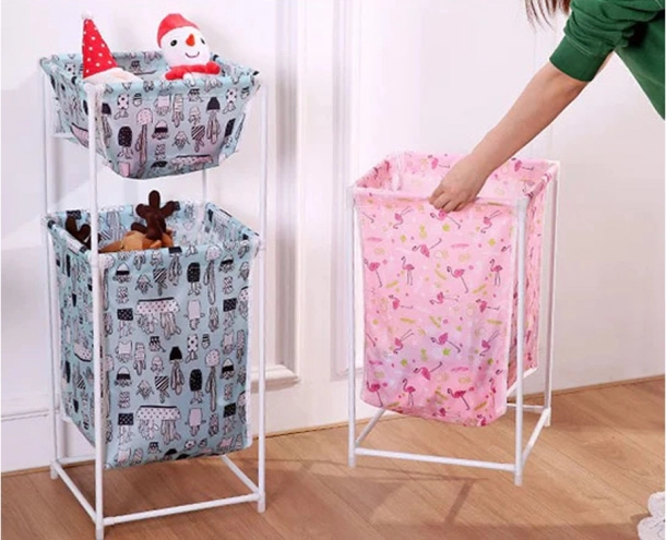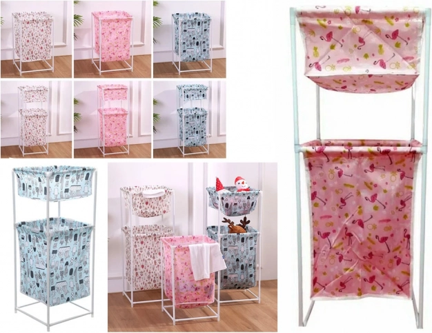 Coșul este disponibil în mai multe culori și modele: crem cu model, roz cu flamingo și albastru cu cactuși.