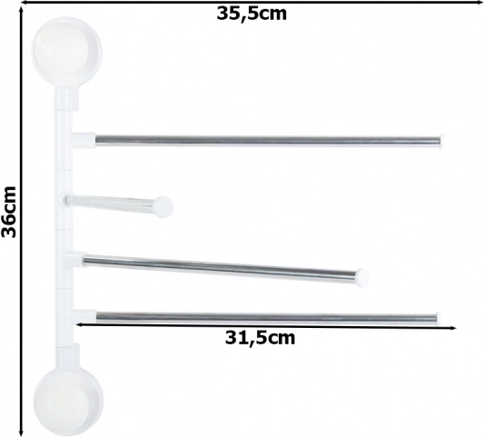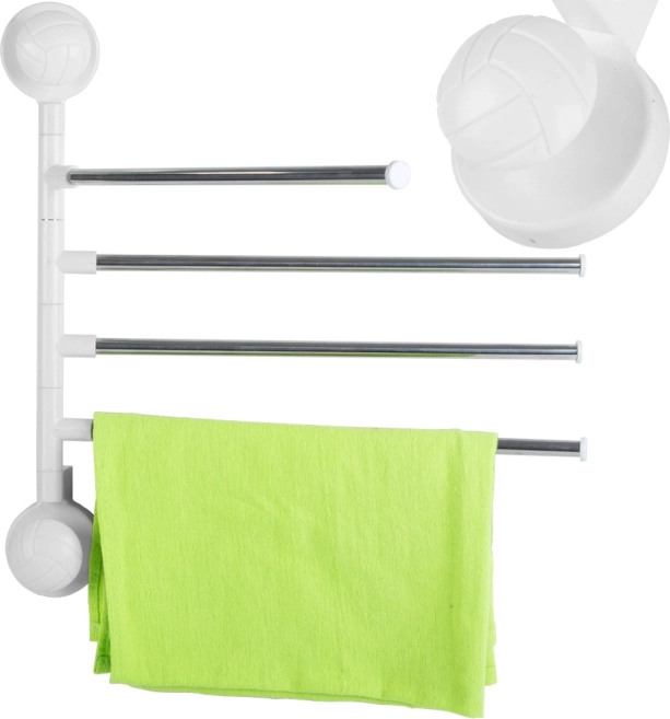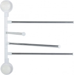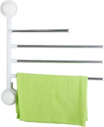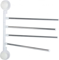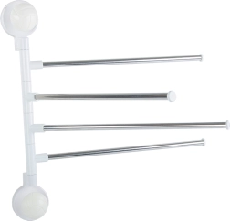 Suportul de perete practic pentru prosoape, cu patru brațe rabatabile, asigură că prosoapele sunt mereu la îndemână și se usucă rapid. Fiecare braț poate fi rotit separat, astfel încât aerul circulă între prosoape și nu se creează dezordine inutilă. Combinația minimalistă de tije metalice și bază albă din plastic se potrivește perfect atât în băile moderne, cât și în cele clasice.