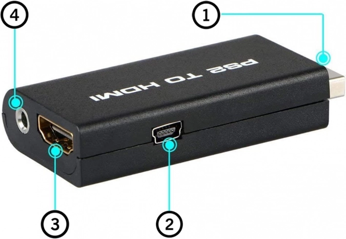 - PS2 (conector consolă), USB 5 V (alimentare), HDMI (video+audio), jack audio de 3,5 mm