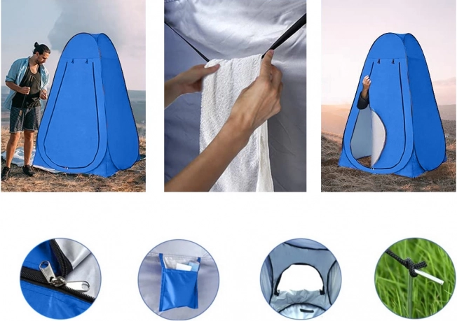 Cort practic și universal pentru intimitate în călătorii – servește drept vestiar, duș și WC. Este autopliabil, impermeabil și, după pliere, ocupă minimum de spațiu. În interior găsiți un buzunar încăpător, o bandă de agățat hainele și un oblonaș de ventilare pentru o circulație mai bună a aerului.