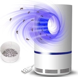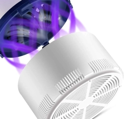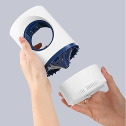 Recipientul colector detașabil permite curățare rapidă și igienică fără contact direct cu insectele. Alimentarea prin USB oferă flexibilitate la amplasare – este suficient un power bank, un adaptor sau un port USB. Designul elegant în alb și albastru închis se potrivește oricărui interior.