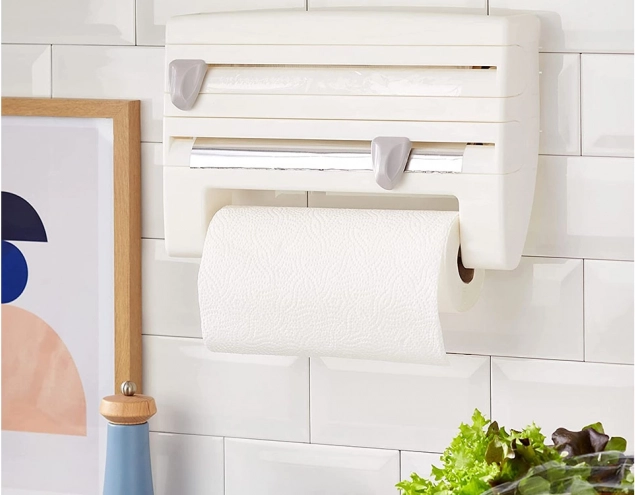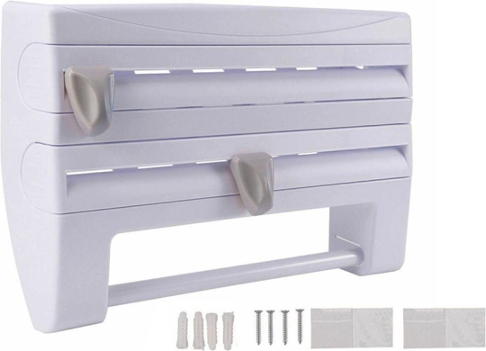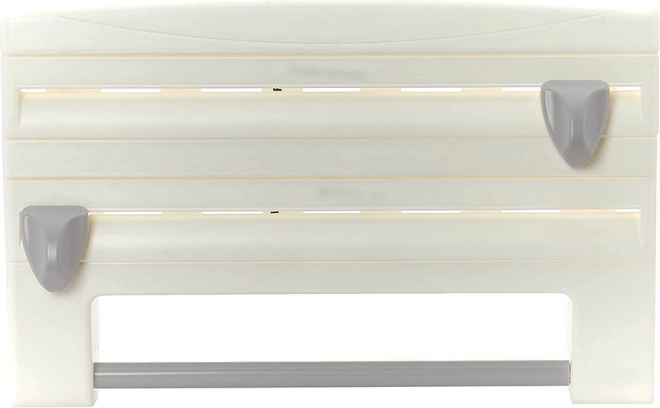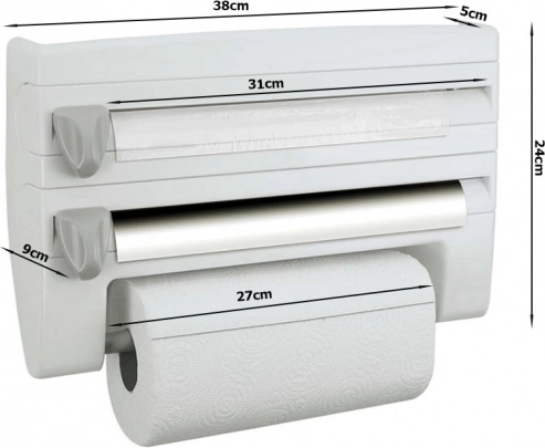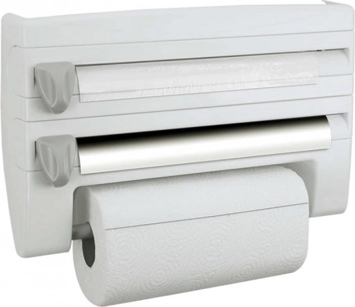 Păstrați ordinea în bucătărie cu organizatorul practic 4 în 1 montat pe perete, care găzduiește folie de aluminiu, folie alimentară și prosoape de hârtie și, în plus, oferă o poliță superioară pentru condimente și mărunțișuri. Datorită lamelor ascunse, precise, rupeți foliile rapid și fără margini zimțate; montajul este ușor și potrivit pentru role standard de până la 31/27 cm.