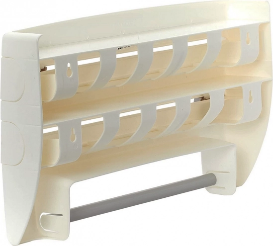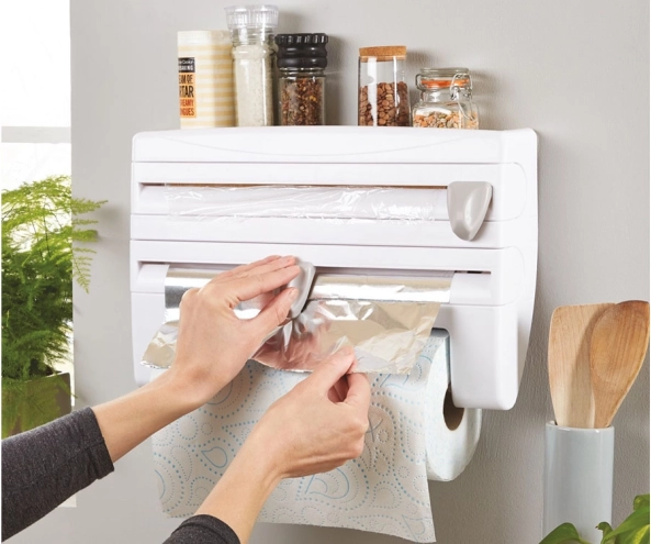Două dozatoare pentru folii, un suport pentru prosoape de hârtie și polița superioară pentru condimente sau mărunțișuri păstrează esențialele din bucătărie într-un singur loc și vă economisesc spațiu pe blatul de lucru.