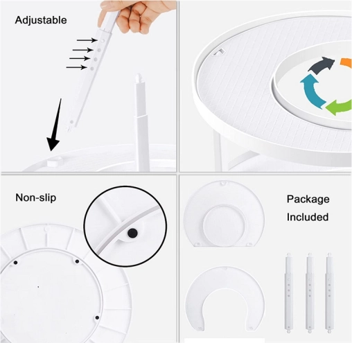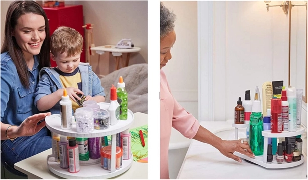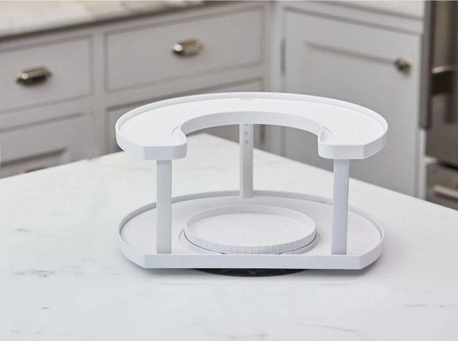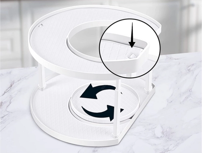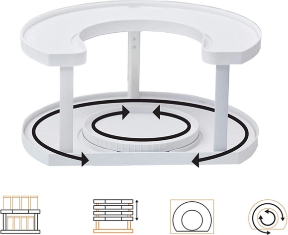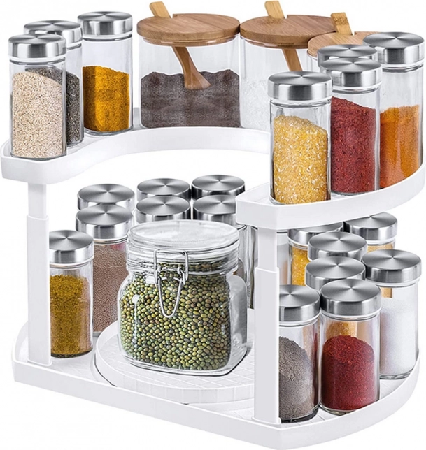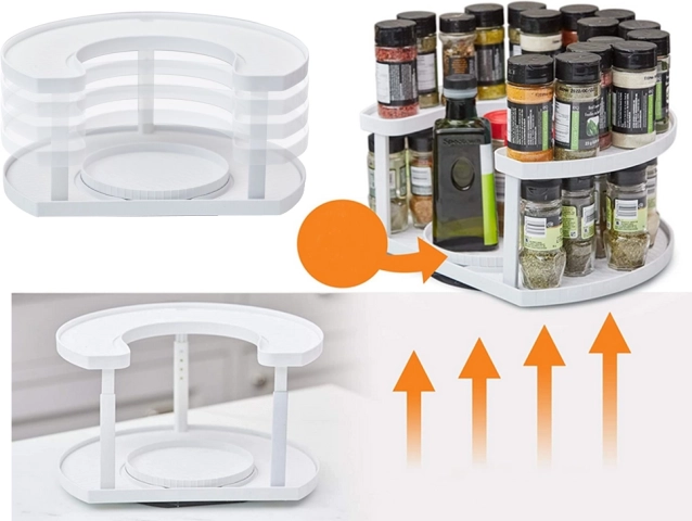 Mecanismul rotativ permite găsirea și scoaterea rapidă a condimentelor sau a produselor cosmetice fără a rearanja întreaga poliță.