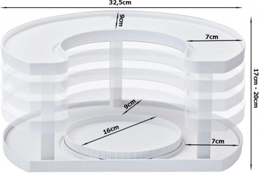 Suportul are înălțime reglabilă 17–20 cm, astfel încât se adaptează dulapului și dimensiunii ambalajelor. Este excelent nu doar pentru condimente, ci și pentru cosmetice, produse de curățenie sau mărunțișuri din baie.