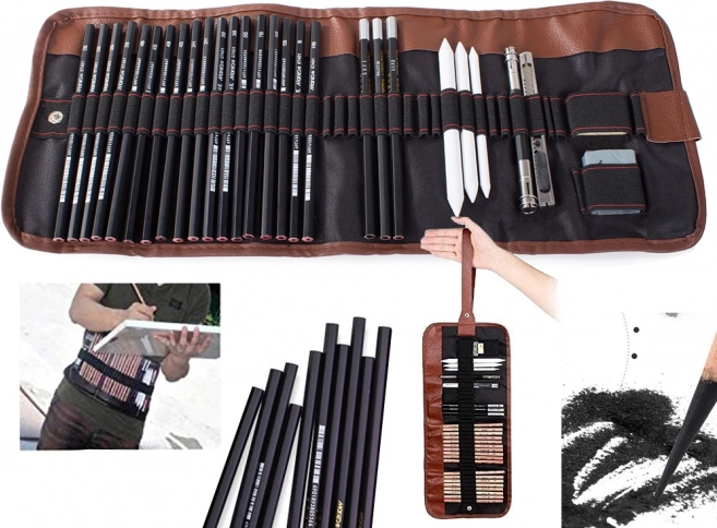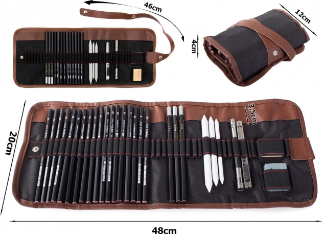 Totul este organizat clar într-o husă rezistentă cu buzunar și 39 de bride elastice, care protejează instrumentele împotriva deteriorării și dezordinii. Husa poate fi agățată de șevalet sau prinsă la brâu pentru confort maxim atât în atelier, cât și pe teren.