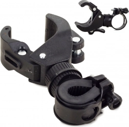 Un suport practic ce permite folosirea unei lanterne de mână ca un far de bicicletă complet. Partea inferioară se prinde de bicicletă cu ajutorul unui șurub, fără a fi nevoie de unelte, iar colierul superior fixează ferm lanterna și permite scoaterea ei rapidă. Mecanismul rotativ facilitează direcționarea fasciculului de lumină exact acolo unde ai nevoie.